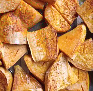 Condimentar: En una bandeja para horno, añadir un chorrito de aceite de oliva y distribuir los trozos de boniato. Espolvorear con sal fina, curry y pimentón. Agregar un poco más de aceite de oliva por encima y mezclar bien para que todos los trozos queden impregnados.